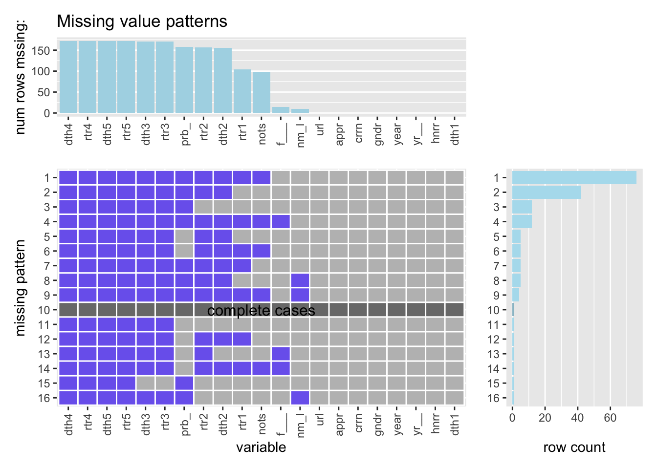 - Like we observed before, only one comic character does not have any missing values. (pattern 10)